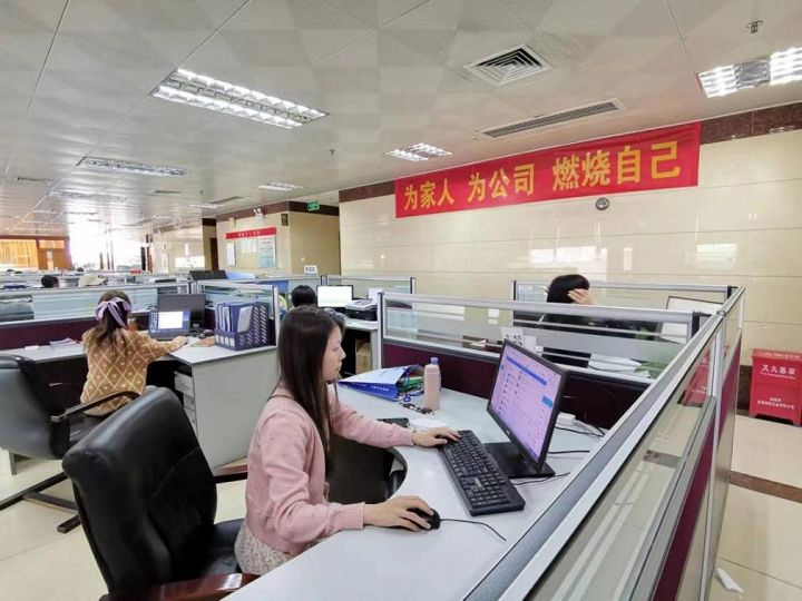 在總部,在“為家人,為公司,燃燒自己”的醒目標(biāo)語(yǔ)下,工作人員各司其職,伏案工作。